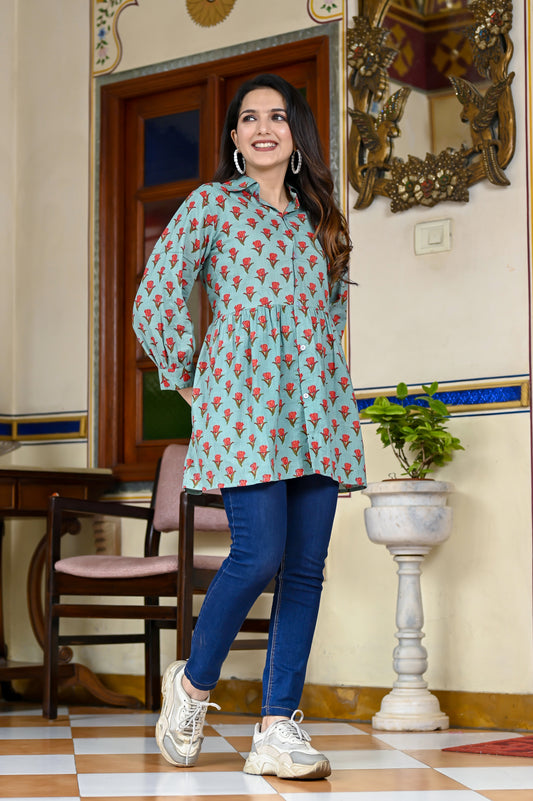 Blue Booti and Jaal Cotton Hand-Block printed co-ord set (Set of 2)